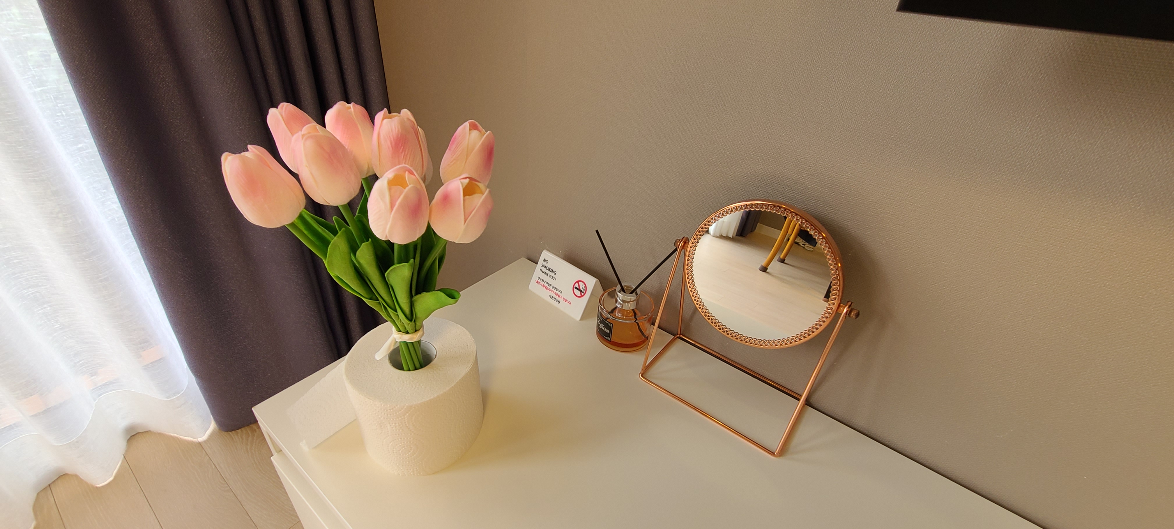 이제부터는 덕천 연수원 객실입니다. 저 꽃은 제가 서울에서부터 가지고 간 조화입니다. 캐리어 넣어 가지고 갔는데, 숙소에 꽃아놓으니 참 예쁘죠? 꽃병이 없어 두루마리 휴지에 넣어놓긴 했는데 나름 괜찮습니다. 꽃 빼고는 다 덕천연수원 물건입니다. 예쁘죠?