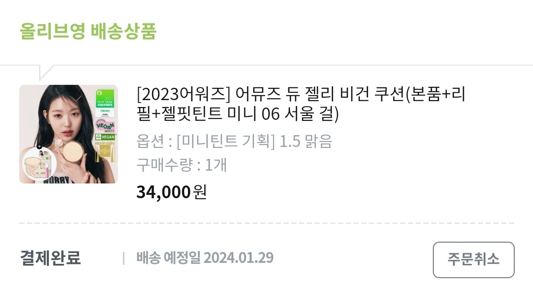 집에 와서 검색해 보니 올리브영에 쿠션과 내가 갖고 싶었던 서울 걸을 미니 틴트 증정품을 넣어 이벤트 중인 게 아닌가! 그래서 바로 질렀다. 아래 사진은 아까 질렀던 내역이다. 올리브영에서 쿠폰을 줘서 3만 원이 되지 않는 가격으로 득템했다.